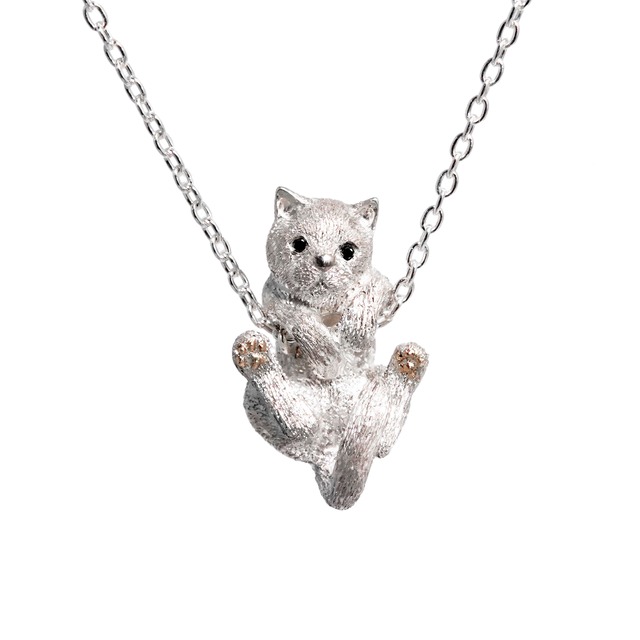 TRÉSOR original ネコをモチーフにした かわいらしさと上品さのあるジュエリー。 毛並みはタガネという工具で、1本1本手作業で打ち込んでいます。 毛の長さ、流れ、やつむじのところまで意識して表現しました。 表情は可愛く見えるよう目元を工夫しています。 細工が細かいので写真では大きく見えがちですが、 実物は小さく可愛らしいサイズに感じると思います。 -------------------------- 素材(体):Pt950 (肉球):K18 ピンク ストーン(目):ブラックダイヤモンド チェーン長さ:55cmスライド式アジャスター ※全長55cmより無段階で短く調整できます。 猫本体サイズ:縦約17mm --------------------------